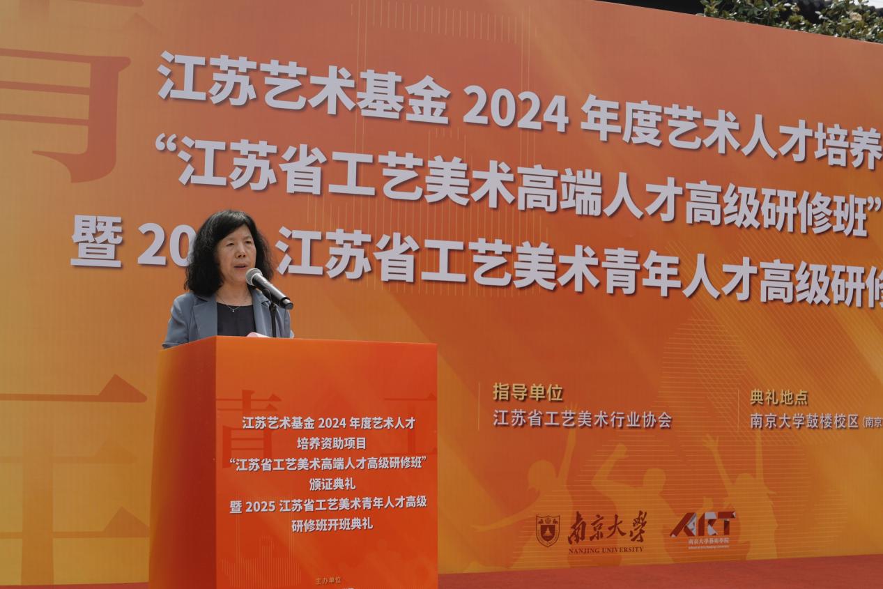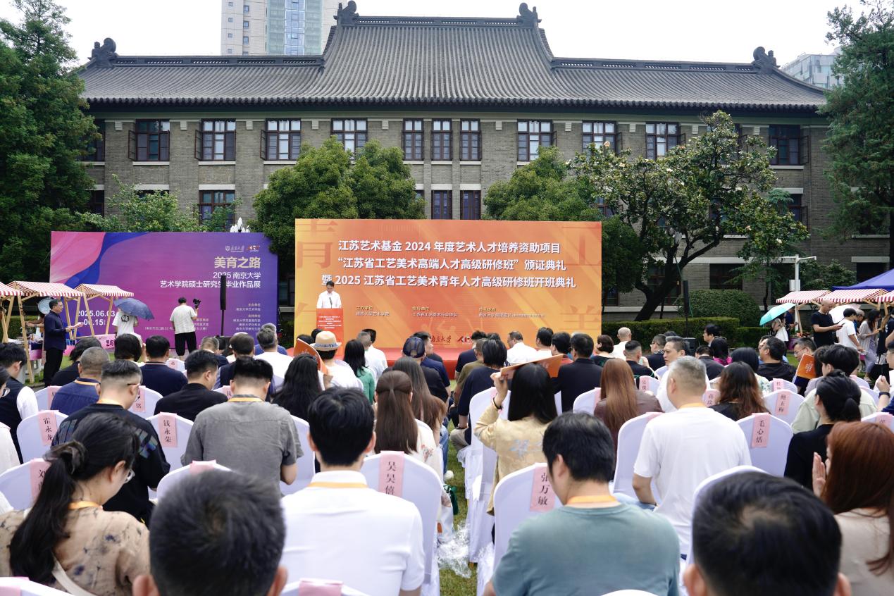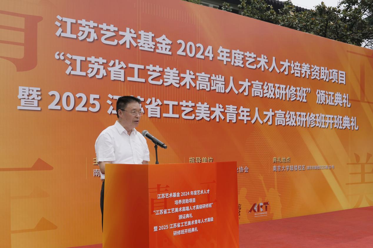 2025年6月8日上午,江苏艺术基金2024年度艺术人才培养资助项目“江苏省工艺美术高端人才高级研修班”颁证典礼暨2025江苏省工艺美术青年人才高级研修班开班典礼在南京大学艺术学院东大楼举行。南京大学党委常委、副校长索文斌,江苏省文联主席章剑华,江苏省文化和旅游厅一级巡视员朱斌,江苏省工艺美术行业协会会长于广云,南京大学艺术学院院长赵奎英出席活动并致辞。