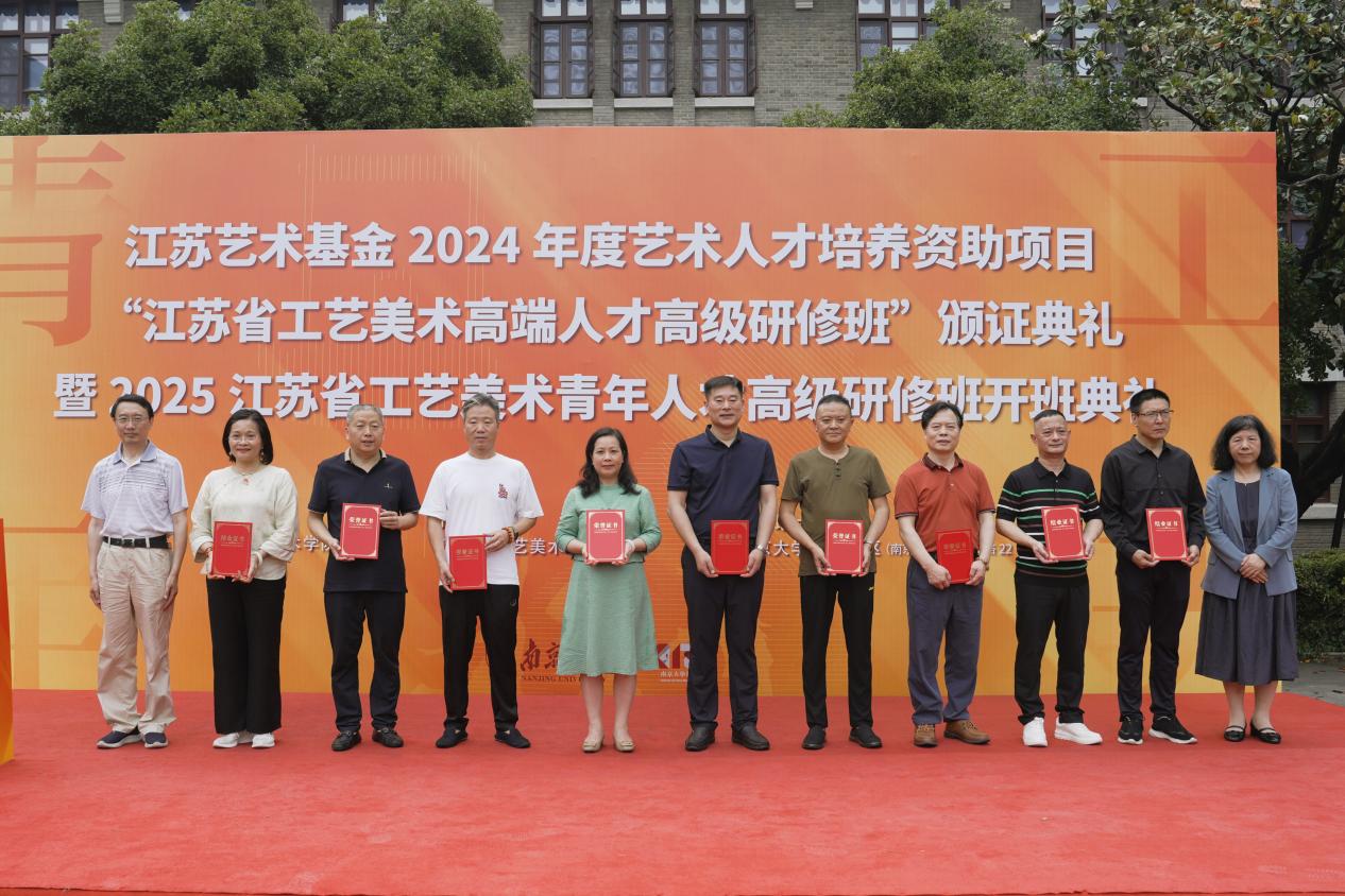 典礼现场,南京大学本科生院院长王骏、艺术学院院长赵奎英为2024年度“江苏省工艺美术高端人才高级研修班”学员代表逐一颁发结业证书。随后,40位2025年度青年人才研修班学员正式入学,标志着江苏工艺美术人才梯队建设的持续推进。