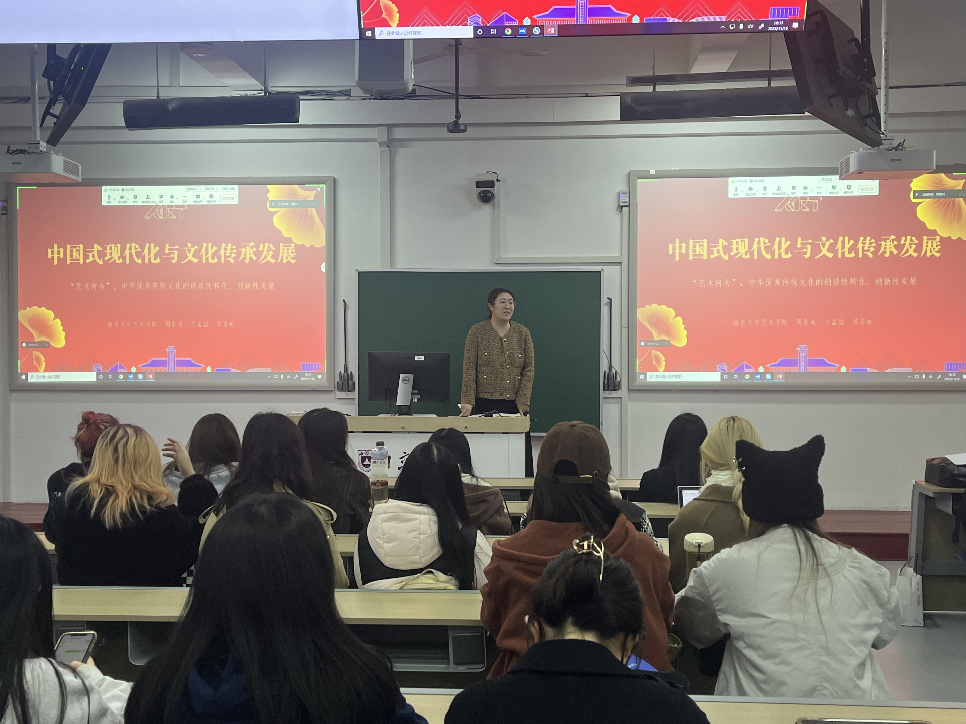 为深入学习贯彻党的二十大精神,学习宣传贯彻习近平文化思想,持续教育引导青年团员在坚定文化自信、讲好中国故事上争做表率,11月16日,艺术学院团委以线上线下相结合的方式,组织开展“中国式现代化与文化传承发展”主题团课,艺术学院团委副书记周素戎主讲,苏霁虹、马孟喆进行实践项目经验分享,全院100余名师生参与学习。